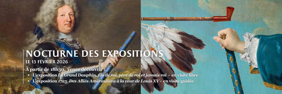 - aux expositions temporairesLe Grand Dauphin, jusqu'au 15 février 2026 et 1725. Des alliés amérindiens à la cour de Louis XV, jusqu'au 3 mai 2026